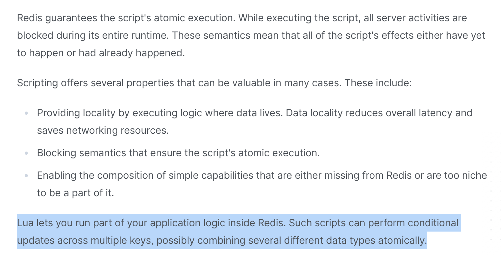 The Redis documentation excerpt explaining Lua scripts are atomic